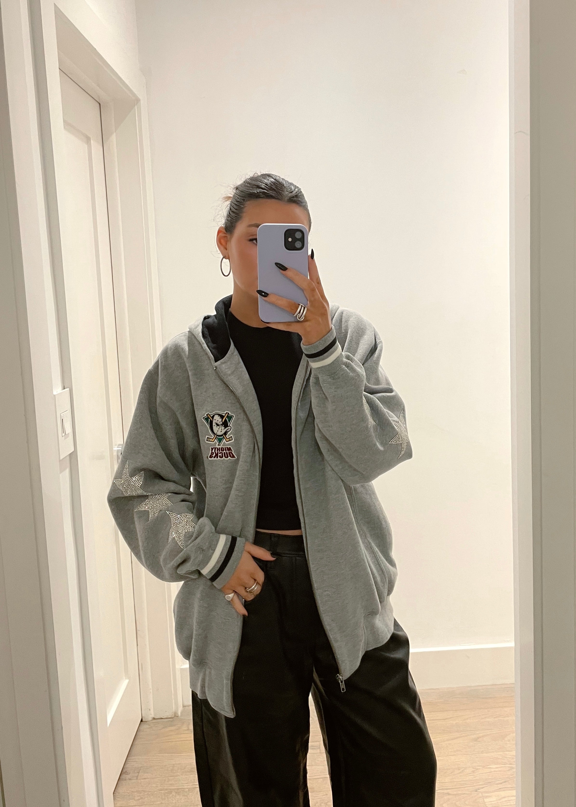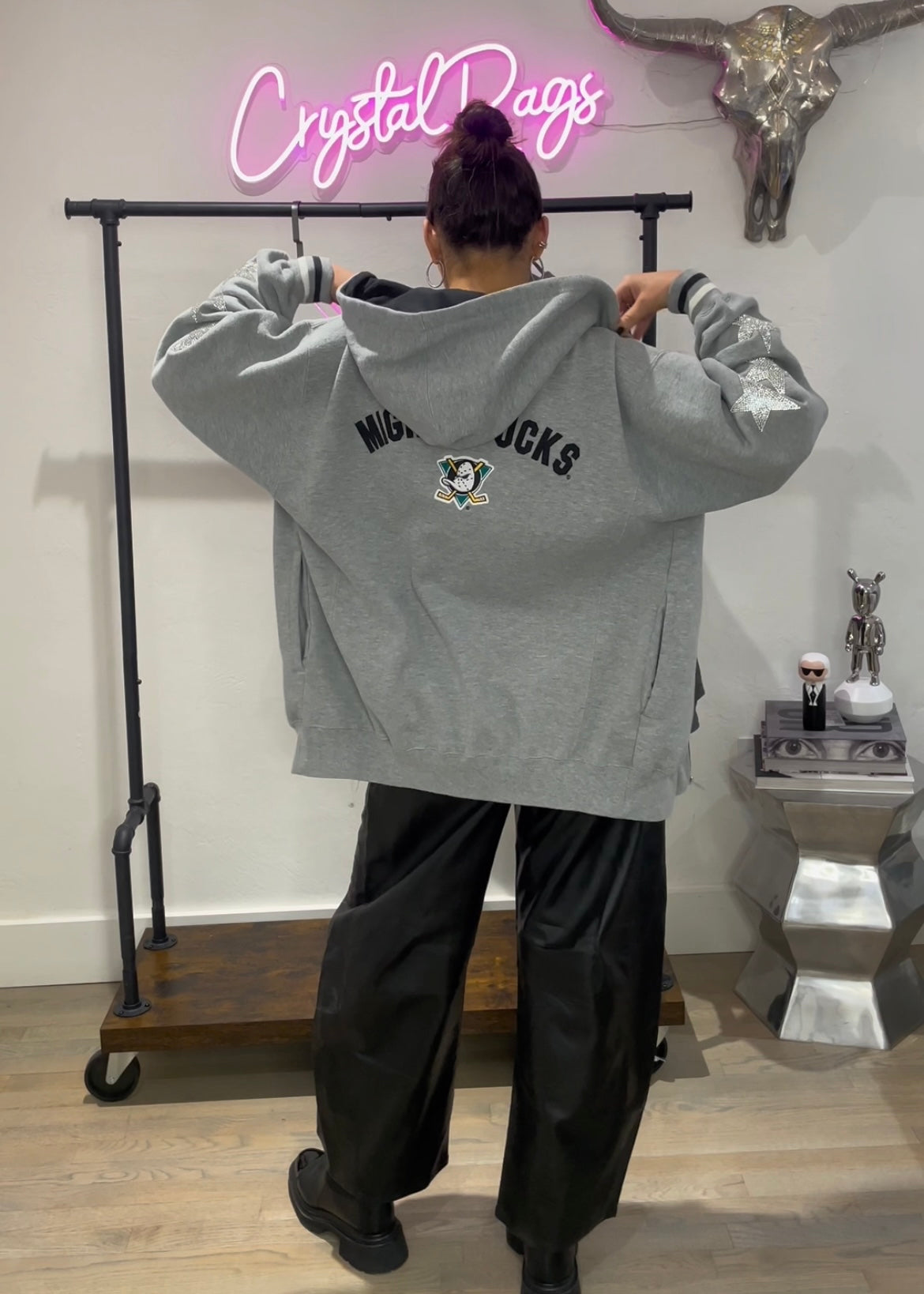Anaheim Ducks, Mighty Duck Hockey, “Rare Find” One of a Kind Vintage Zip Up Hoodie with Crystal Star Design                                                                                                                                                    - Soft, frayed, oversized depending on the person                                                               - Size: L/XL                                                                             - Color: Gray