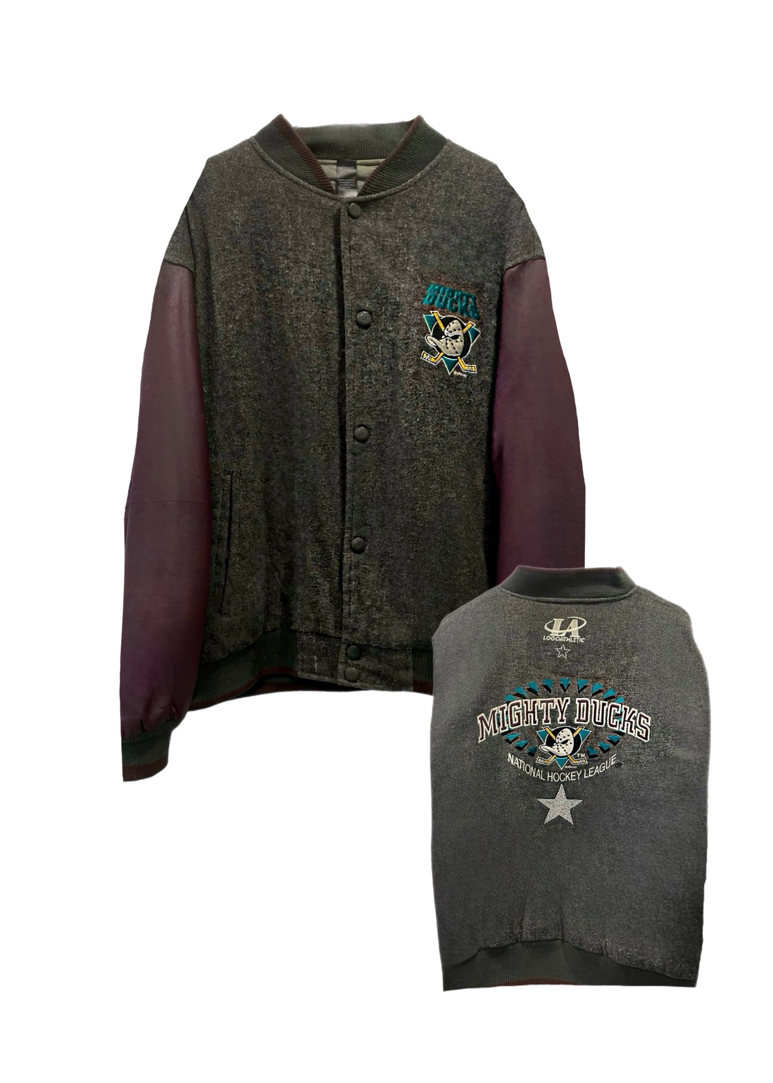 Anaheim Ducks, Hockey One of a Kind Vintage “Mighty Duck” Jacket with Leather Sleeves and Crystal Star Design - Statement piece with back design - Soft, frayed, oversized depending on the person - Size: M/L - Color: Gray & Burgundy