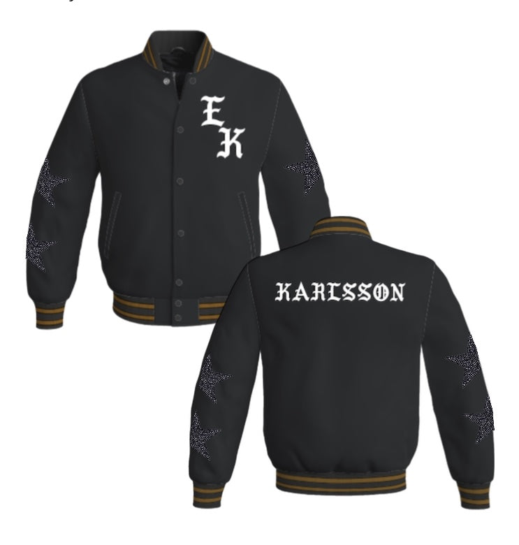 Vegas Golden Knights, Hockey Custom Satin Bomber Jacket with Monogram and Black Crystal Star Design - Satin, oversized depending on the person. - Size: M - Color: Black Satin, Trim Black with Old Gold Trim Detail as Per Picture - Lead Time: 4-6 Weeks
