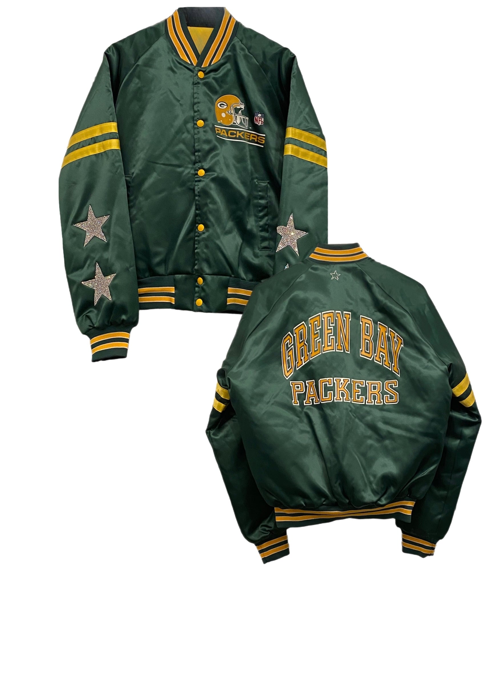 Green Bay Packers, Football One of a KIND “Rare Find” Vintage Satin Bomber Jacket with Crystal Star Design