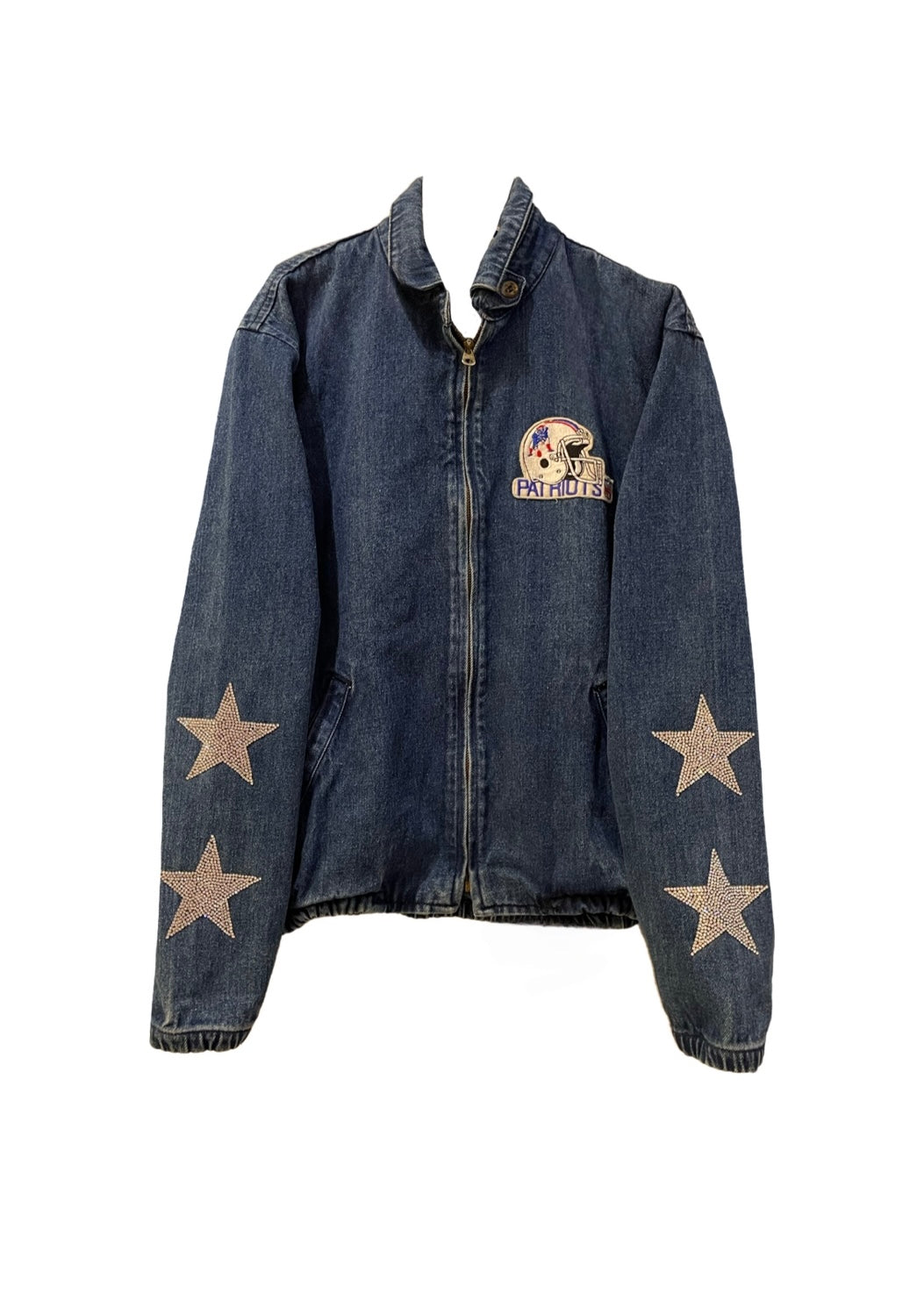 New England Patriots, NFL One of a KIND Vintage “Rare Find” Denim Bomber Jacket with Crystal Star Design