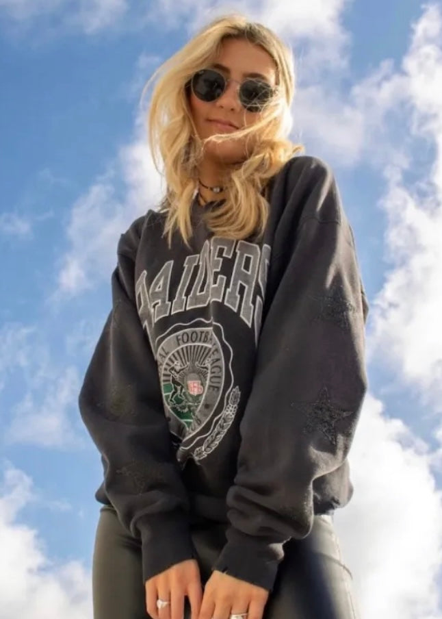Las Vegas Raiders, Football One of a KIND Vintage Sweatshirt with Black Crystal Star Design.                                                       - Soft, frayed & oversized depending on the person