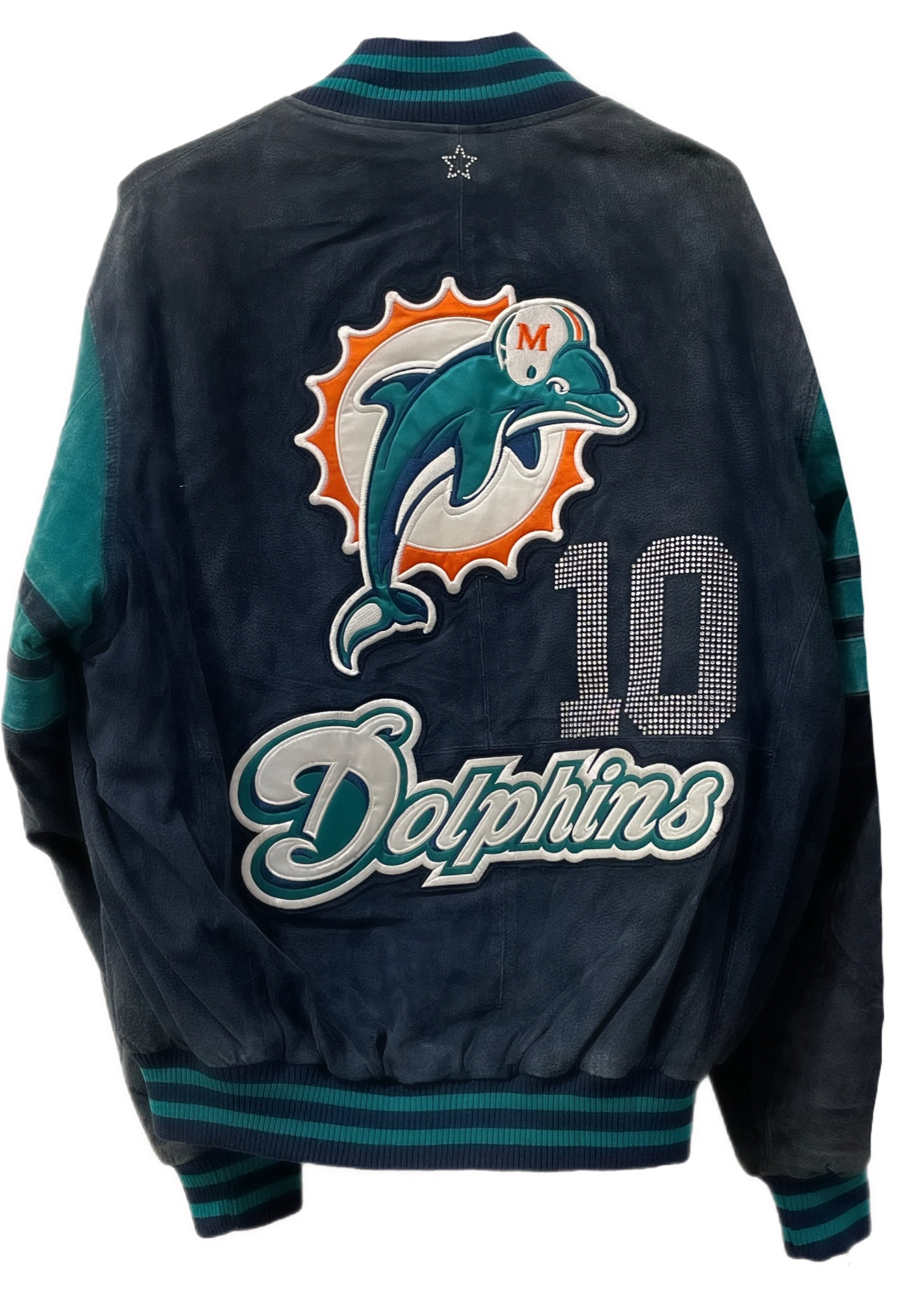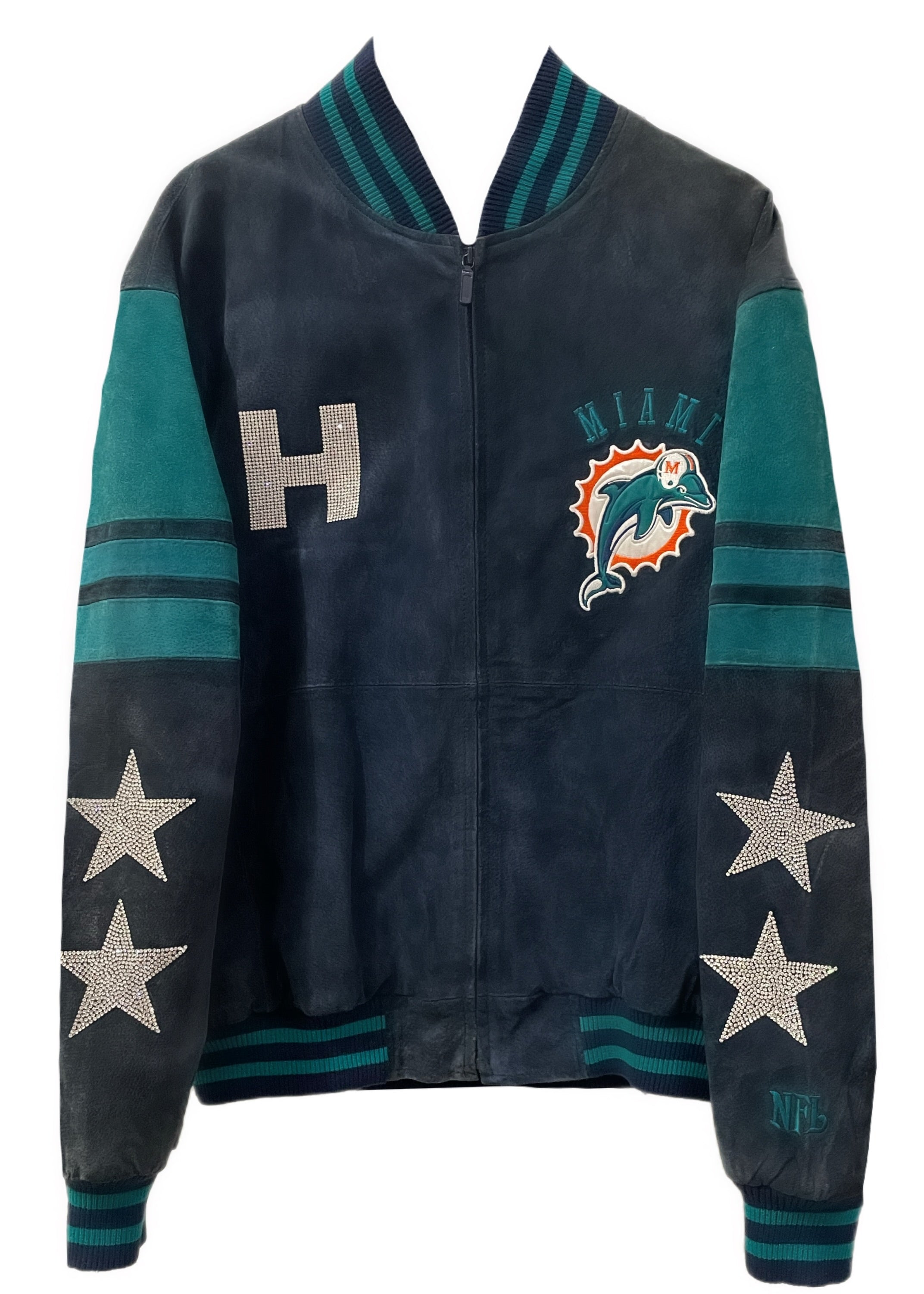 Miami Dolphins, FootballFootball “Rare Find” One of a KIND Vintage Suede Jacket with Crystal Star Design, Custom Crystal Number & Initial